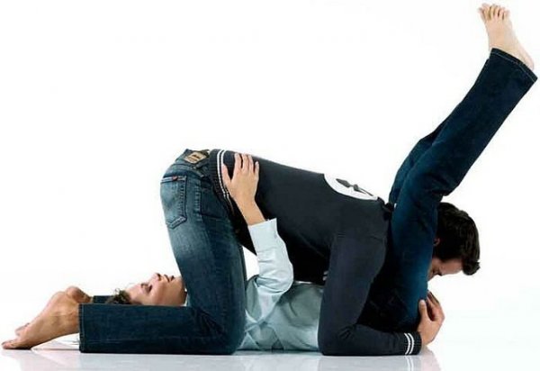 Один человек вытягивается и переносит вес тела в одну сторону, затем поднимает ногу и кладет ее на плечо партнера. Другая их нога остается вытянутой под своим партнером.