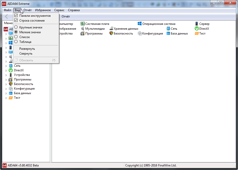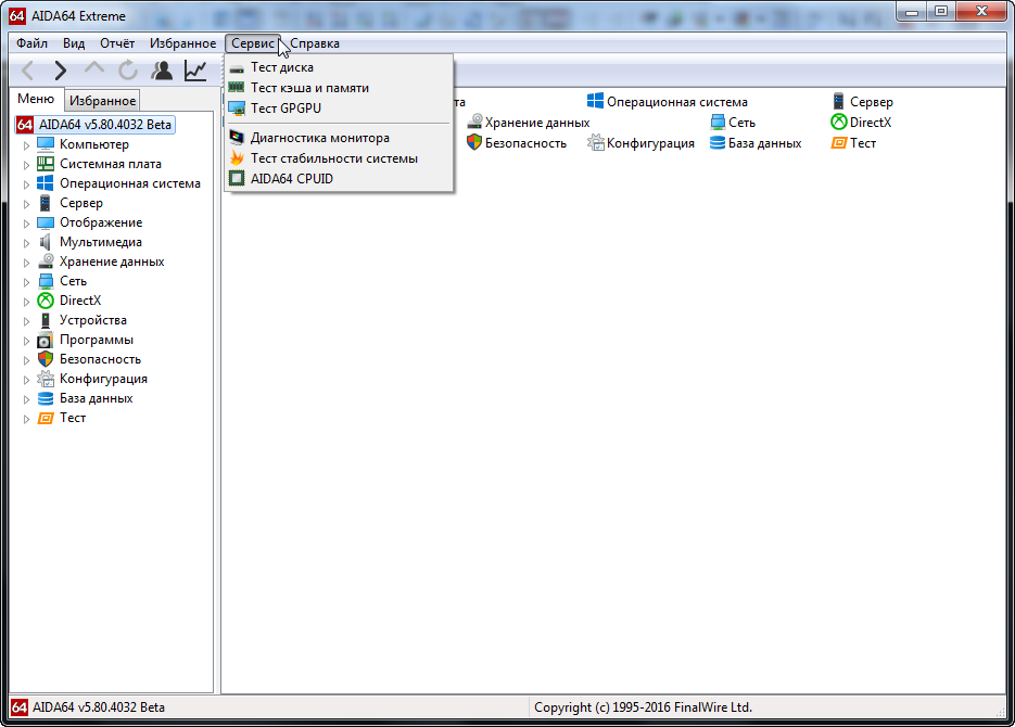 В главном окне AIDA64, в левой колонке расположены вкладки «Меню» и «Избранное». Во вкладке «Меню» находятся разделы: «Компьютер», «Системная плата», «Операционная система», «Сервер», «Отображение», «Мультимедиа», «Хранение данных», «Сеть», «DirectX», «Устройства», «Программы», «Безопасность», «Конфигурация», «База данных», «Тест». В свою очередь, в этих разделах есть подразделы для более конкретного выбора компонента системы.