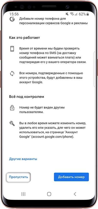 Появится предложение привязать аккаунт к номеру телефона. Нажмите «Пропустить». Вы сможете добавить номер позже.