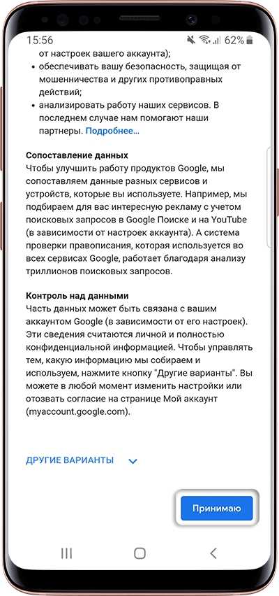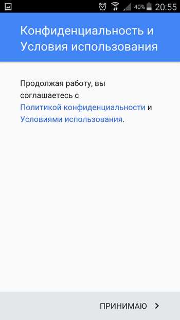 На следующем экране появятся условия использования аккаунта. Просмотрите, пролистайте вниз и нажмите «Принимаю».