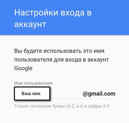 3. Придумайте имя пользователя. Оно должно содержать только латинские буквы и цифры. Именно это имя будет указано перед @gmail.com. Например, если вы выбрали ник AndroidLime, то почтовый адрес будет выглядеть следующим образом: [email protected].