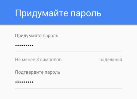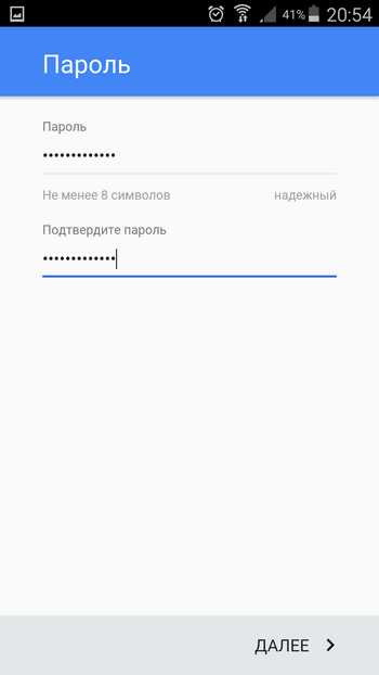 - На следующем экране необходимо придумать пароль не менее 8 символов и ввести его дважды для проверки ошибок при вводе. Тапаем опять на кнопке «Далее».