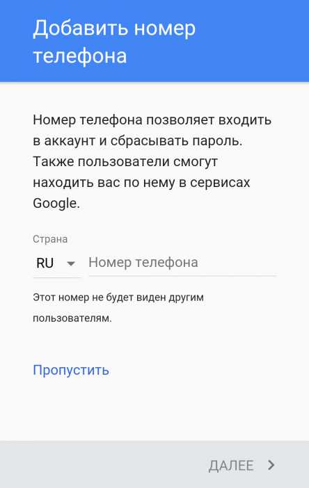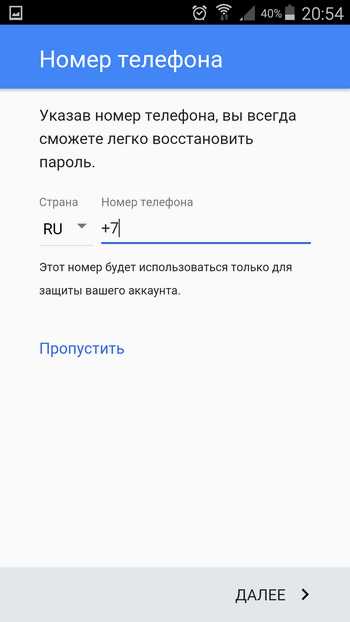 Пропустить» для перехода к следующему этапу. В случае, если номер телефона введен, то жмем на «Далее» и ждем пару минут входящей смс с контрольным кодом. Если симка находится в смартфоне, с которого происходит регистрация, то процедура продолжится автоматически, в противном случае код вводится руками.