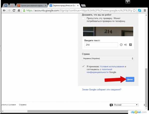 На этом этапе продолжаем заполнение регистрационной формы. Обратите внимание, что введение телефонного номера является необязательным. Далее вводим цифры, изображенные на картинке и ставим отметку, что Вы принимаете условия использования Google. -