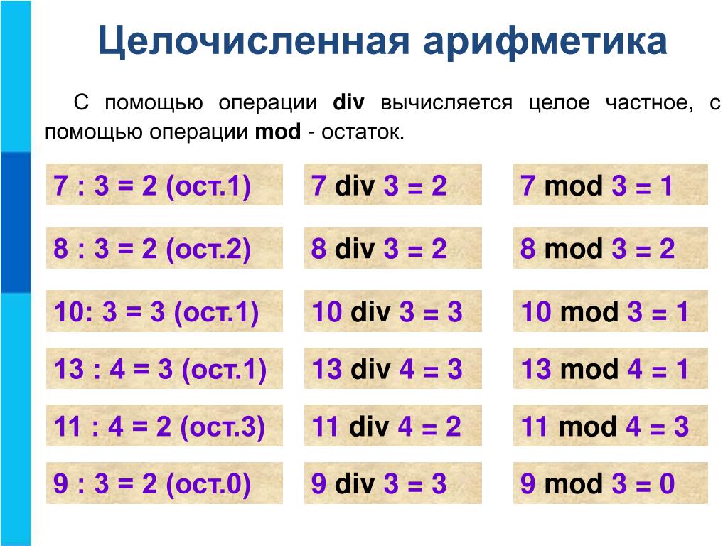 Например, «5 mod 3 = 2», что означает, что 2 – это остаток при делении 5 на 3.