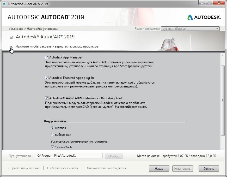 - установить пробную версию AutoCAD 2019 «РЕКОМЕНДУЕТСЯ предоставленная сборка».