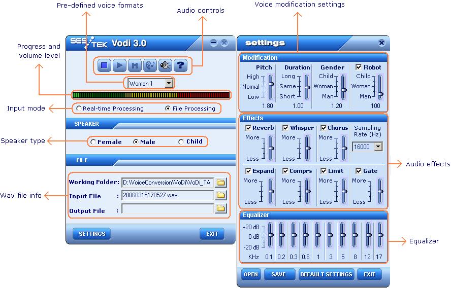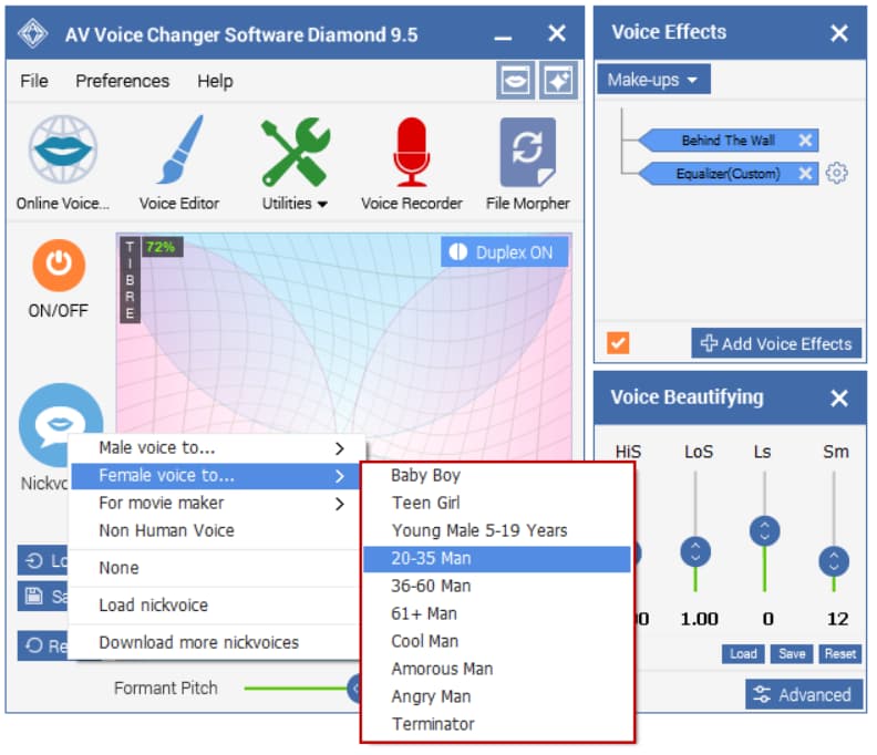 Эта программа была разработана для получения профессиональных результатов в элегантном, простом в использовании интерфейсе. Вы можете заставить любой голос звучать более женственно, мужественно, по-детски, моложе или старше или даже звучать как голос знаменитости. |