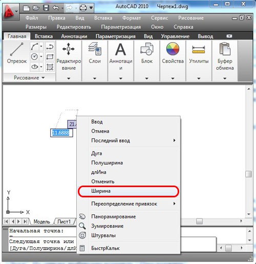 К примеру, мы начертили несколько сегментов и выбрали в командной строке параметр “полуширина“.