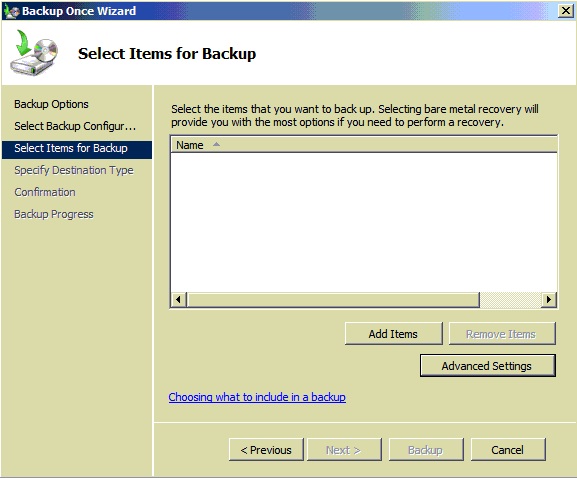 5. На экране Select Items for Backup укажите элементы, которые вы хотите включить в резервную копию.