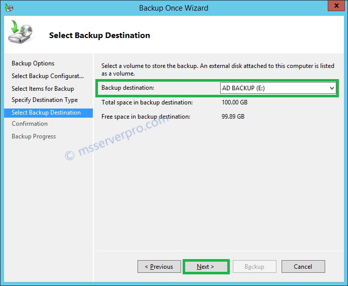 9. Подтверждение 9Экран 0104 позволяет перепроверить правильность настройки всех параметров резервного копирования. Когда все готово, нажмите кнопку Backup . Резервное копирование должно занять некоторое время в зависимости от размера сервера контроллера домена. После успешного завершения резервного копирования вы можете закрыть Мастер резервного копирования.