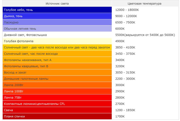| 9000-10000 К | Тень или сильно пасмурное небо |