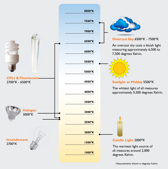 Высокая цветовая температура обозначает холодный цвет, низкая — тёплый. Цвет температурой от 6 000 кельвинов и выше уже считают холодным, а меньше 4 700 кельвинов — тёплым. Например, цветовую температуру свечи оценивают примерно в 1 000 градусов по Кельвину, а пасмурное небо — в 6 500 кельвинов. При этом нейтральной температурой, при которой свет белый, дневной, считают диапазон от 4 700 до 6 000 кельвинов.