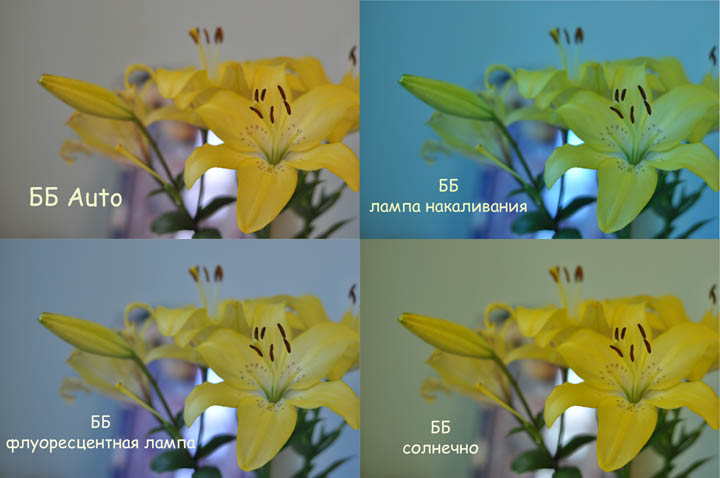 Некоторые фотоаппараты имеют также еще и «брекетинг баланса белого», это означает – что три фотографии сделанные подряд – будут иметь разный баланс белого (если Вы это разрешите в настройках) – для того чтобы по крайней мере хотя бы один из кадров «попал в точку». Этот режим применяется тогда, когда Вы не уверены в правильности настройки ББ.