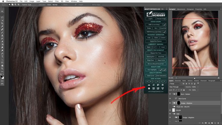 Это также поможет вам оставаться организованным, потому что панель создана так, как большинство ретушеров редактируют свои файлы. Это означает, что вы найдете осветление и затемнение прямо под обычными инструментами, затем идет частотное разделение и, наконец, функции для кожи и макияжа. В нижней части панели вы также можете найти функции контроля качества, а также наиболее часто используемые корректирующие слои, которые могут пригодиться в любое время во время ретуширования.