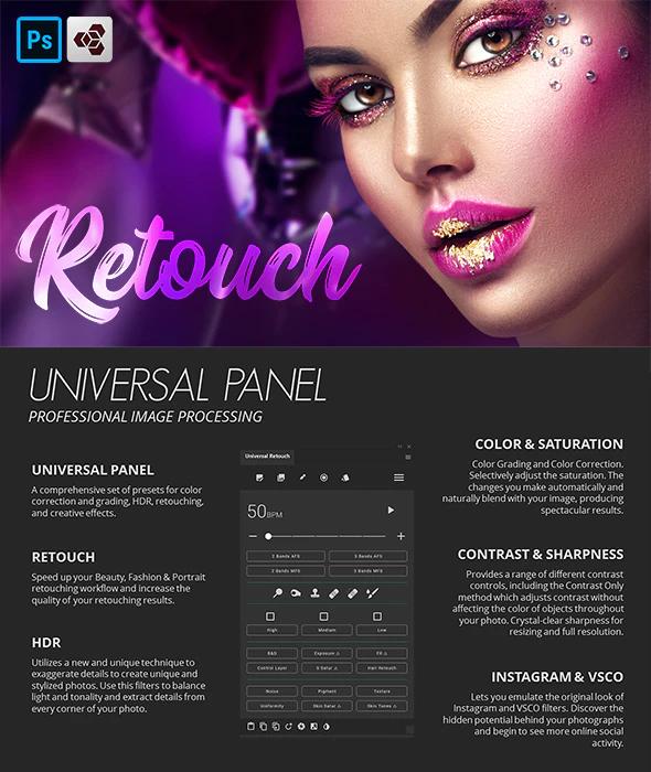 - Впечатляющая панель ретуширования, используемая в Adobe Photoshop, которая позволит вам создавать потрясающие и привлекающие внимание изображения.