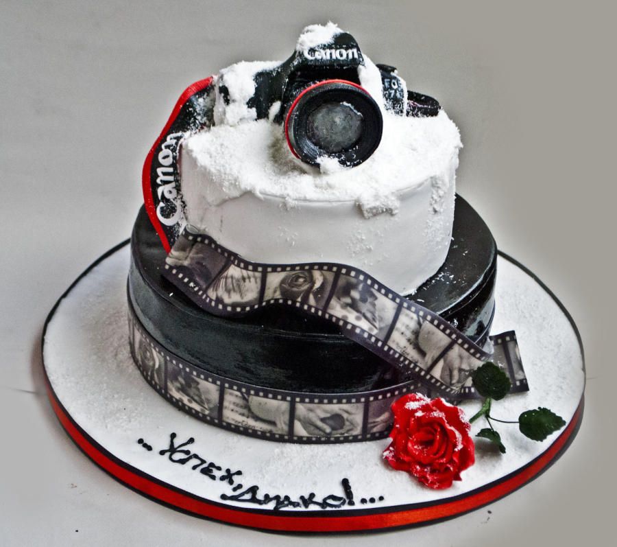 - Торт, выпеченный на заказ с любимой начинкой именинника и фигуркой фотоаппарата на нём – отличный подарок фотографу на день рождения.