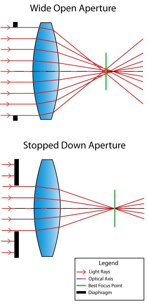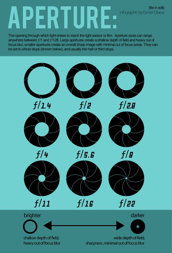 Проще говоря, число f-stop привязано к диафрагме. Чем выше значение f-stop, тем меньше диафрагма, а значит, меньше света попадает в камеру. Чем меньше число диафрагмы, тем больше диафрагма, тем больше света попадает в камеру.