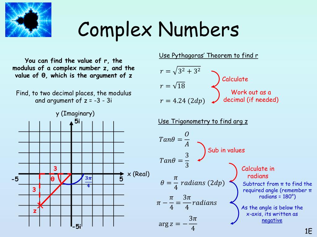 Однако все, что нам нужно сделать, чтобы получить аргумент, — это подумать о том, где находится это комплексное число в комплексной плоскости. В комплексной плоскости чисто мнимые числа лежат либо на положительной оси \(у\), либо на отрицательной оси \(у\) в зависимости от знака мнимой части.В нашем случае мнимая часть положительна, поэтому это комплексное число будет лежать на положительной оси \(y\). Следовательно, главное значение и общий аргумент для этого комплексного числа: