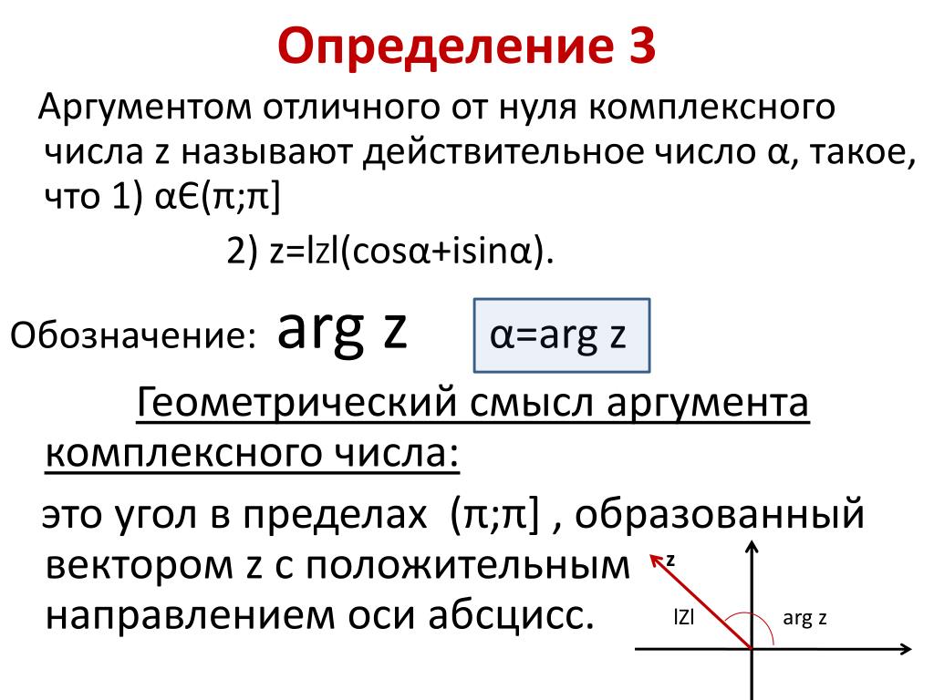 Аргументом комплексного числа z = a + ib (z ≠ 0) называется величина угла между положительным направлением действительной оси и вектором z→; величина угла считается положительной, если угол отсчитывается против часовой стрелки, и отрицательным в противном случае.