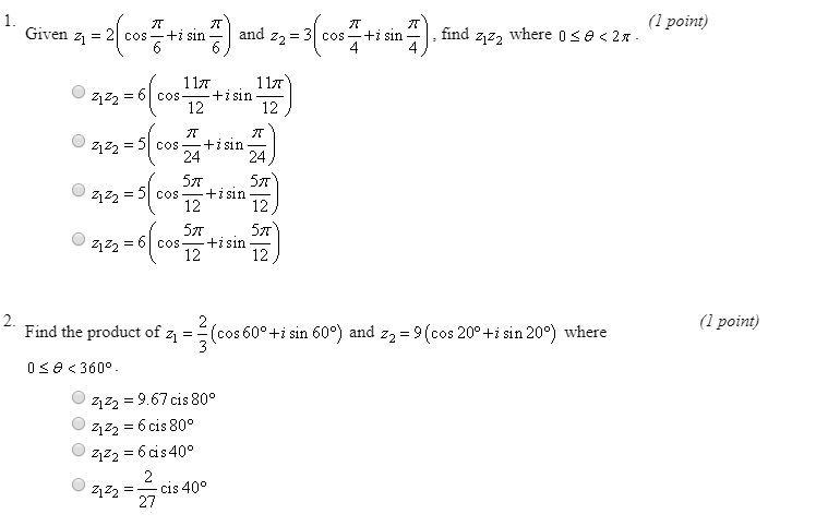\begin{align}{z_1}{z_2} & = {r_1}\,{r_2}\left( {\cos \left({{\theta _{\,1}} + {\theta _{\,2 }}} \right) + i\sin \left( {{\theta _{\,1}} + {\theta _{\,2}}} \right)} \right)\label{eq:eq12} \\ & \номер \\ \frac{{{z_1}}}{{{z_2}}} & = \frac{{{r_1}}}{{{r_2}}}\left( {\cos \left({{\theta _{\ ,1}}\, - \,\,{\theta _{\,2}}} \right) + i\sin \left( {{\theta _{\,1}}\, - \,\, {\theta _{\,2}}} \right)} \right)\label{eq:eq13}\end{align}