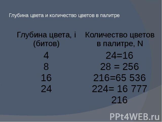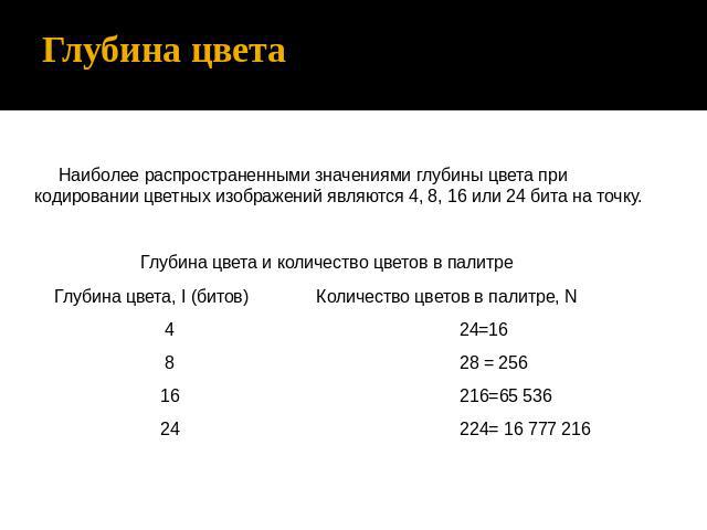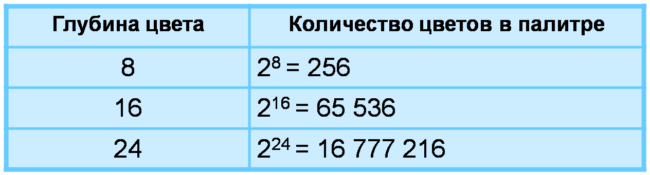 В приведенных выше таблицах глубина цвета в битах вычисляется для каждого канала в соответствии с количеством битов, необходимых для каждого пикселя.