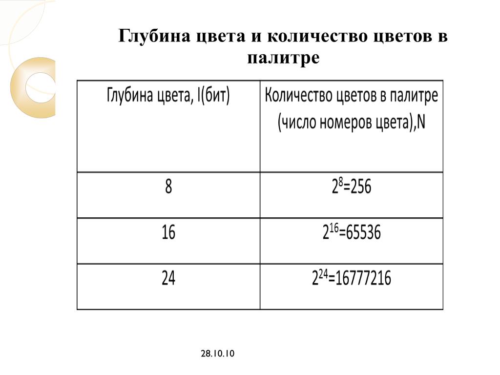 Если цветовое пространство определяет диапазон доступных интенсивностей цвета (гамму), то глубина в битах определяет, насколько точным мы можем быть с этими спецификациями. Иными словами, битовая глубина определяет, насколько точно можно указать разницу между одним цветом и другим.