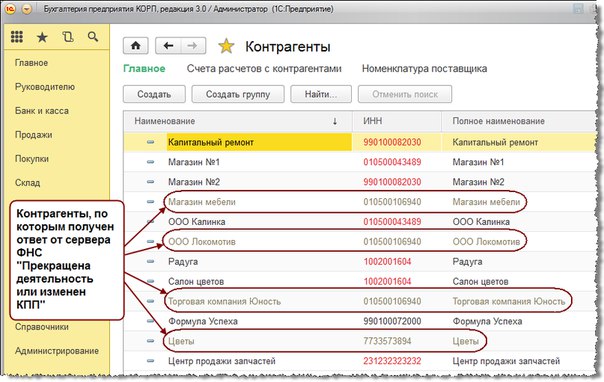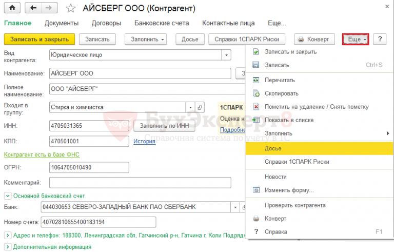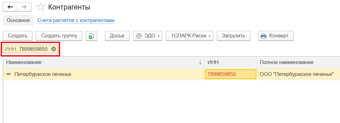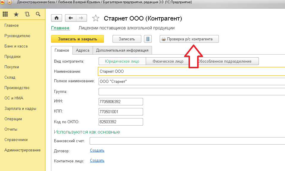Бухгалтером предприятия информация о данном контрагенте вносится в единую информационную базу данных, для которой преимущественно используется платформа 1С.