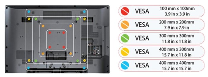 VESA MIS-F Размер экрана от 31′>-и далее… Крепежные отверстия по меняющемуся шаблону. от VESA 200X200 и далее. примеры: VESA 400X600 VESA 300X500 VESA 400X700 VESA 500X900 и т.д. |