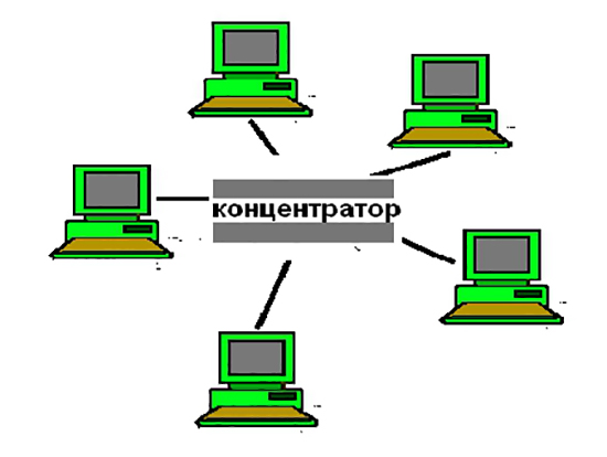 Если в качестве центрального узла использовать не компьютер, а специальное устройство-концентратор (повторитель) сразу на все узлы звезды, то мы получим т.н. пассивную звезду. Пассивная звезда логически эквивалентна (не физически) шине, так как сигнал от передающего абонента поступает всем узлам сети и логика доступа также получается последовательная.