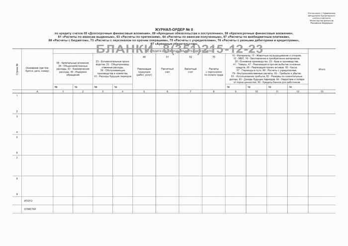 Журнал-ордер по форме №8 оформляется для учета операций с авансовыми денежными средствами, деньгами, которые поступают в качестве выплат от контрагентов, расходы с дебиторами и кредиторами.