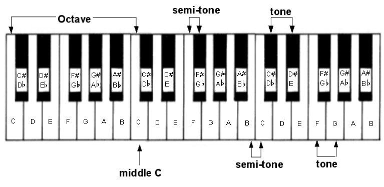 Остальные пять имеют названия, образованные от основных семи, для чего применяют специальные символы: # — диез и b — бемоль. Диез означает, что звук расположен выше на полутон звука, к которому он приставлен, а бемоль — ниже. Важно помнить, что между ми и фа, как и между си и до лишь полутон, поэтому не может быть до бемоль или ми диез.