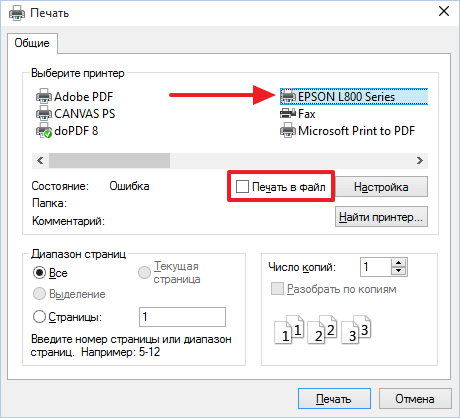 - Убедитесь, что для печати выбран физический принтер, а не Adobe PDFXPS/Send note или любой другой виртуальный принтер.