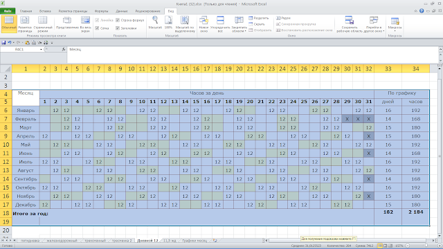 В табеле учет отработанного времени ведется по стандартным правилам, в соответствии с принятым планом работы. Предоставление выходных дней по скользящему графику осуществляется исходя из производственных потребностей организации и не ориентировано на общепринятые выходные дни.