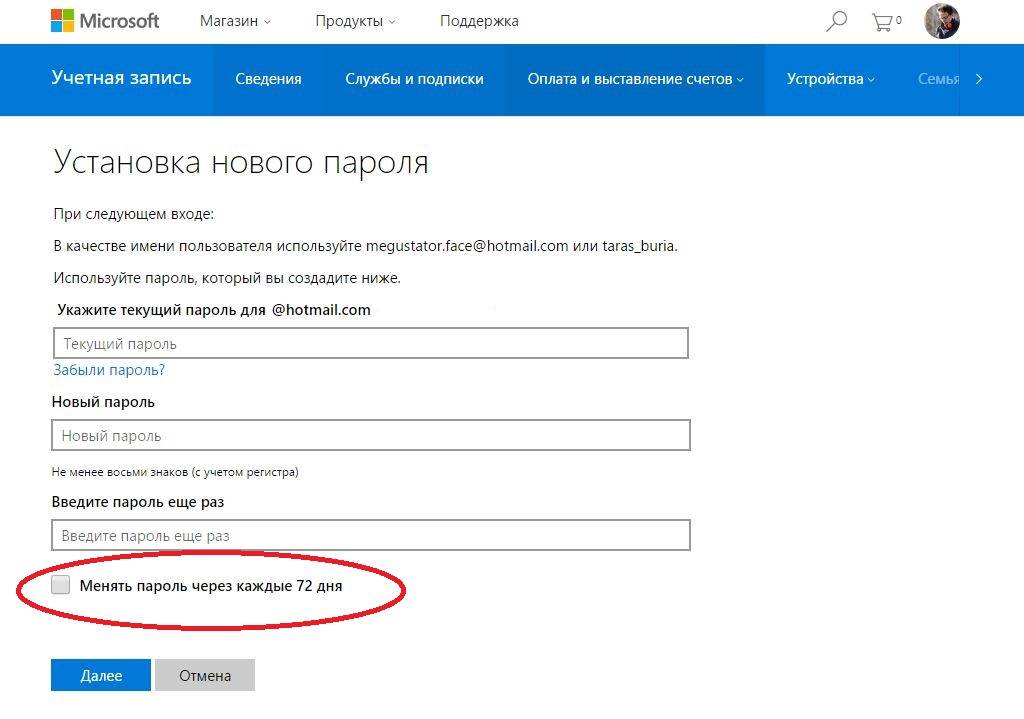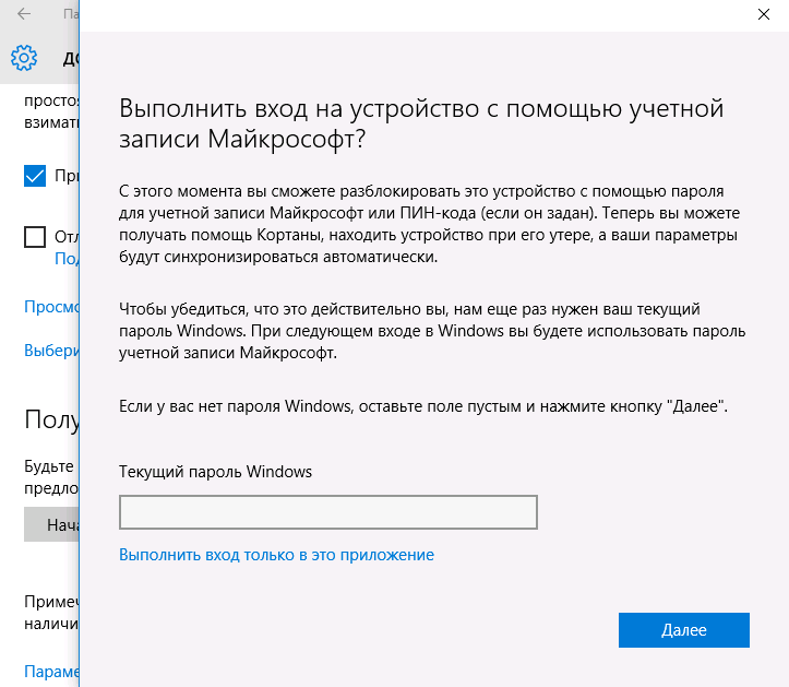 В первой строке окна введите тот пароль, который был определен при установке операционной системы. Заполните вторую строку новым паролем, который в дальнейшем станет использоваться для входа в операционную систему и доступа к сервисам Microsoft. Перейдите к следующему шагу нажатием кнопки «Далее».