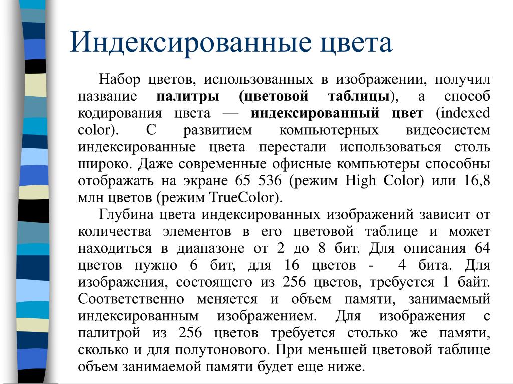 Индексированным цвет называется потому, что к каждому файлу этого режима прилагается как бы «оглавление» («index» по-английски). В специальной цветовой таблице сохраняется информация о том, какие именно цвета задействованы в изображении, а при сохранении самого изображения просто используется «ссылка» на нужный цвет в цветовой таблице. Таким образом, не нужно каждый раз сохранять полную информацию о цвете, находящемся в изображении. Единожды занеся его в таблицу, в дальнейшем мы можем указывать этот цвет как «цвет № 25» или «цвет № 187».