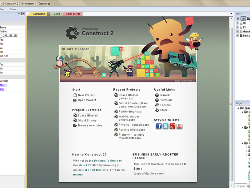 Кадрами анимации можно управлять на диафильме. В бесплатной версии Construct 2 есть много замечательных функций, которые могут предложить всем, кто интересуется дизайном 2D-игр. Он не требует навыков кодирования и подкрепляется богатой документацией. Чтобы лучше понять, что вы можете создать с помощью этого игрового движка, вы можете ознакомиться с презентацией игры.