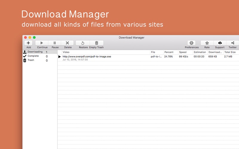 - Поддерживает запуск и приостановку обработки очередности загрузок, позволяет докачать файлы после паузы.