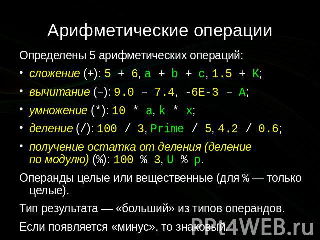 Арифметические операторы используются для выполнения арифметических операций с числами (константами или переменными):