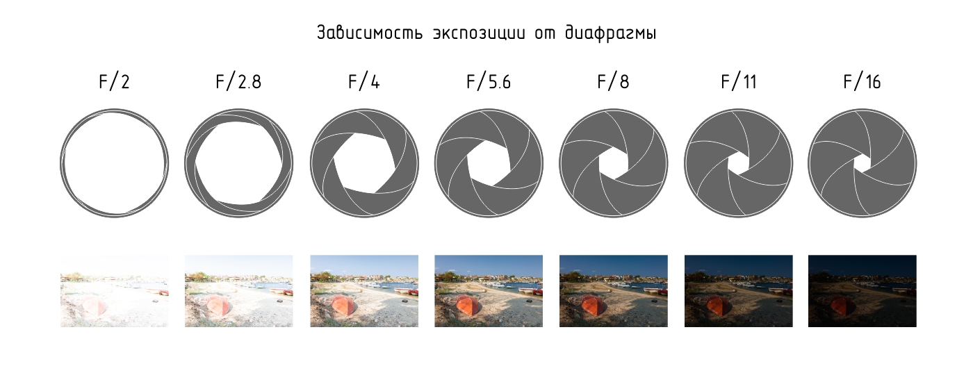 Говоря простым языком, диафрагма — это дырка внутри объектива, которая пропускает через себя определенное количество света. Принцип работы очень схож с нашими глазами. Попадая в светлое пространство, зрачок сужает свой диаметр, и наоборот — находясь в темной комнате, глаз работает в ином режиме, зрачок открывается полностью, пропуская максимум света.