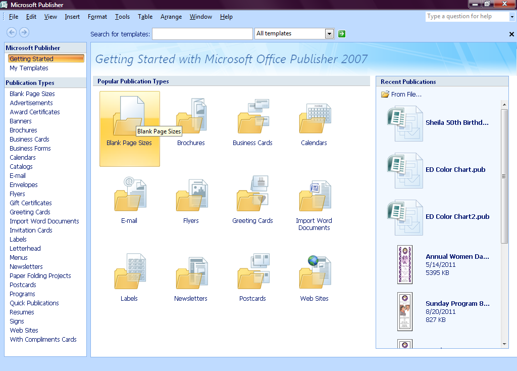 - Перейдите на начальную страницу Publisher, нажав File > New . Появятся доступные шаблоны.