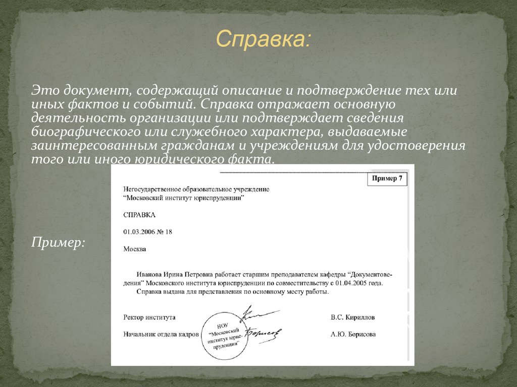 Справка — это документ, содержащий описание или подтверждение тех или иных фактов, событий. Различают справки служебного и личного характера. Служебные справки составляются по запросу вышестоящей организации или должностного лица.