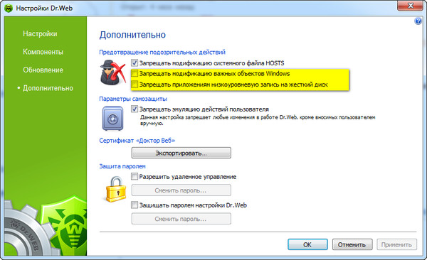 Web или важный компонент (сторож SpIDer Guard, Брандмауэр) отключены, что ослабляет защиту антивируса и компьютера. Включите Самозащиту или отключенный компонент;