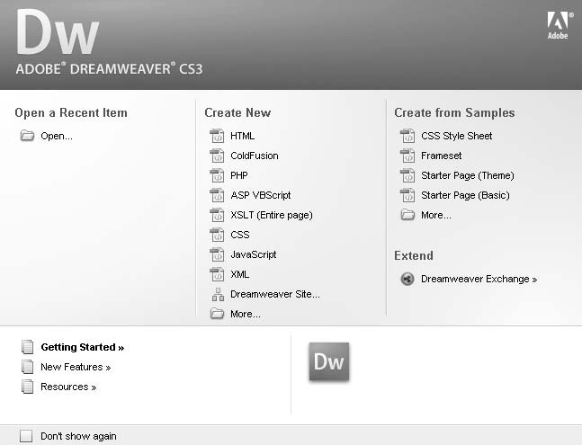 В меню Пуск выберите Все программы » Adobe Design Premium CS3 » Adobe Dreamweaver CS3.