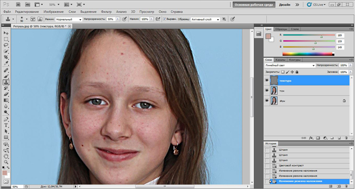 Удобно убирать чешуйки-шелушение на лицах детей в слое High_Retouch, при этом не «размазывается» цвет и не появляются круглые пятна на лице от штампика и лечащей кисти.