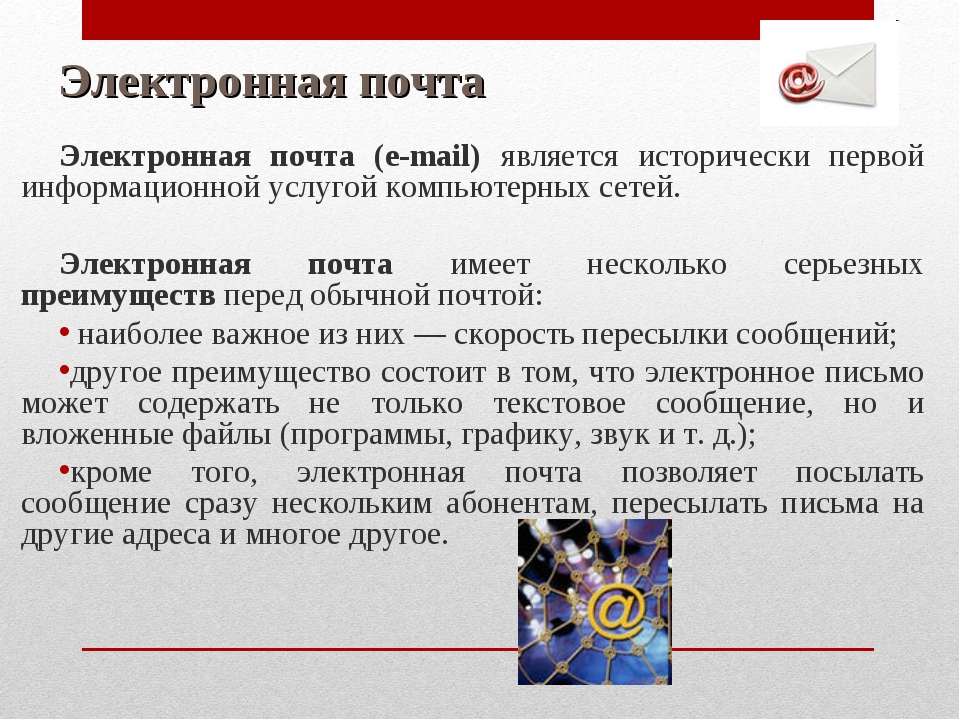 Начало работы с электронной почтой На этой страницеЭлектронная почта (E-mail — сокращение от electronic mail) является удобным и быстрым средством связи с другими людьми. Электронную почту можно использовать для различных целей.