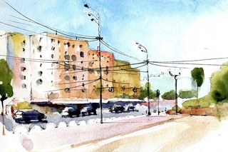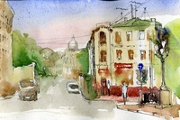 Городской пейзаж — это не только картины. Это еще и зарисовки, скетчи с натуры. Ведь отправляясь в неизвестный город, к примеру, у нас совсем мало времени для того, чтобы его написать акварелью. А вот сделать графическую зарисовку и подкрасить ее акварелью — это недолго.