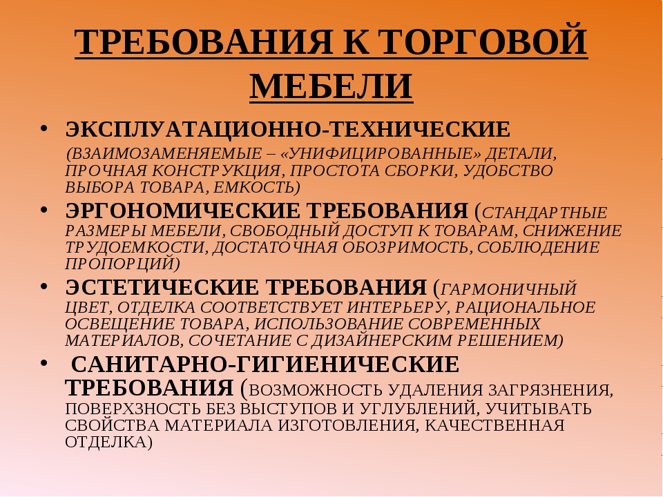 Требования эстетики услуги торговли предусматривают гармоничность, стилевое единство, целостность композиции и художественной выразительности при оформлении интерьера торгового зала, витрин, выкладки товаров на торговом оборудовании, рабочего места, исполнения рекламных материалов (п. 5.5 Государственного стандарта Российской Федерации ГОСТ Р 51304-99 Услуги розничной торговли. Общие требования , введенного в действие постановлением Госстандарта России от 11 августа 1999 г.