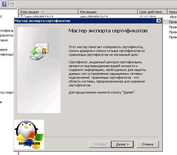 Экспорт сертификата с закрытым ключом.