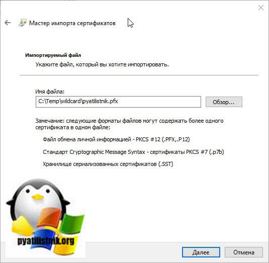 - Откройте .pfx файл. Сразу запустится «Мастер импорта сертификатов».