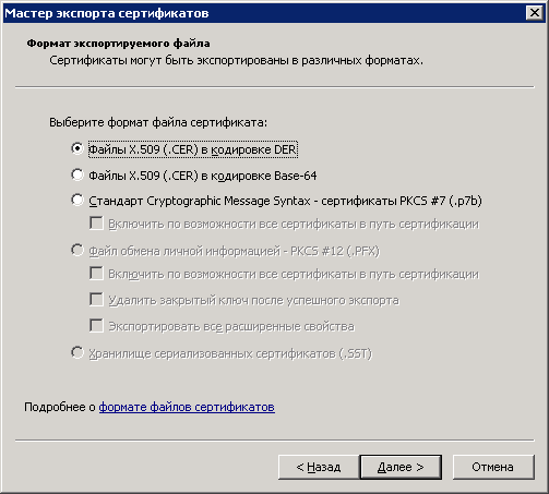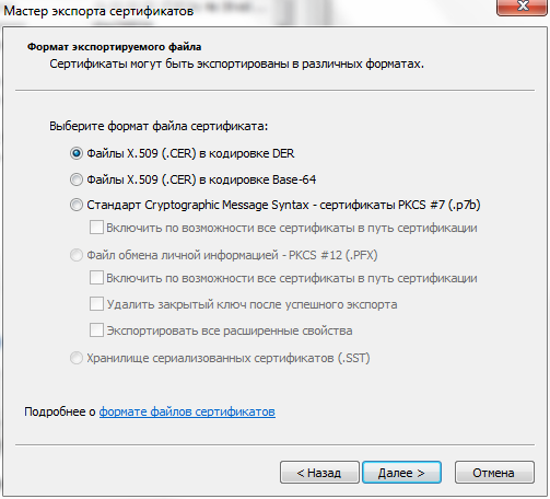 - В окне «Формат экспортируемого файла» выбрать «Файлы X.509 (.CER) в кодировке DER» и нажать на кнопку «Далее».